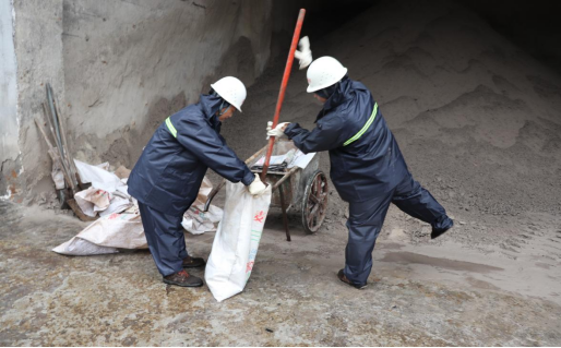 圖三:班組人員裝沙袋至外排水溝防止?jié){液外泄