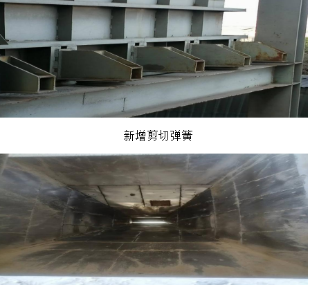 檢修班在接到任務(wù)后,立即對該問題產(chǎn)生的根源進(jìn)行梳理,對卸料應(yīng)力進(jìn)行計(jì)算和綜合分析,在確保徹底消除隱患、穩(wěn)定可靠、簡單易行和力爭最低成本的原則下研究可行性技改方案,決定采取四管齊下 1.在每個(gè)石膏倉與框架接觸部位均布增設(shè)剪切彈簧10個(gè)(使應(yīng)力緩釋)。2.將倉內(nèi)錐段原不沾板改為不銹鋼板(滿焊)并直段噴涂鱗片樹脂(使石膏緩降,減小沖擊并消除腐蝕)。3.在真空泵出口增設(shè)減震膨脹節(jié)(隔斷設(shè)備運(yùn)行震動(dòng))。4.繼續(xù)對卸料空氣炮深挖潛能進(jìn)行技改(以致順暢下料)。