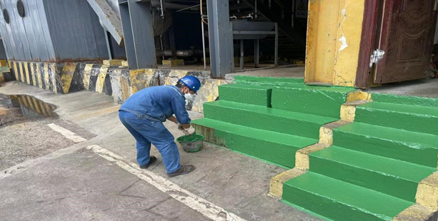 工作開展之前,安全員陳江嚴(yán)格按照安全環(huán)保管理要求,對(duì)防腐刷漆工作中可能存在的高空墜落、油漆飛濺等危險(xiǎn)因素詳細(xì)辨識(shí),根據(jù)實(shí)際需要配備安全帶、防護(hù)面罩、警戒帶等防護(hù)器具,現(xiàn)場(chǎng)講解安全防范措施,按照班前會(huì)流程進(jìn)行安全宣貫。廠區(qū)刷漆的同時(shí),廠區(qū)道路兩旁的道沿也受到了特別“呵護(hù)”:水處理生產(chǎn)班組自行組成刷漆小分隊(duì),在蒸發(fā)全廠范圍開展了“亮化廠區(qū)環(huán)境,提升廠容廠貌”道路沿石警戒線義務(wù)刷漆。生產(chǎn)班組采用黃黑相間油漆粉刷,對(duì)全廠所有道路沿石進(jìn)行刷漆。本次刷漆百分百覆蓋廠區(qū)道路沿線,共計(jì)約300多米。