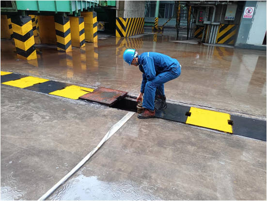 在搶險(xiǎn)處置流程中,各應(yīng)急小組迅速響應(yīng),化驗(yàn)檢測組首先對(duì)脫硫地溝及雨排水溝進(jìn)行了pH檢測,并將檢測結(jié)果向總指揮匯報(bào)。隨后,安全警示組用安全警示帶對(duì)現(xiàn)場搶險(xiǎn)區(qū)域進(jìn)行了封鎖和警戒,生產(chǎn)搶險(xiǎn)組穿戴好雨衣雨靴等應(yīng)急裝備,啟動(dòng)了2#循環(huán)泵以保證主煙囪指標(biāo)穩(wěn)定,并聯(lián)系電工對(duì)1#循環(huán)泵及其進(jìn)口電動(dòng)閥進(jìn)行了斷電處理。在關(guān)閉閥門過程中,一名操作人員不慎眼睛進(jìn)入大量漿液,醫(yī)療救護(hù)組立即用洗眼器對(duì)其進(jìn)行了清洗和救護(hù),受傷人員精神狀態(tài)良好,無大礙。